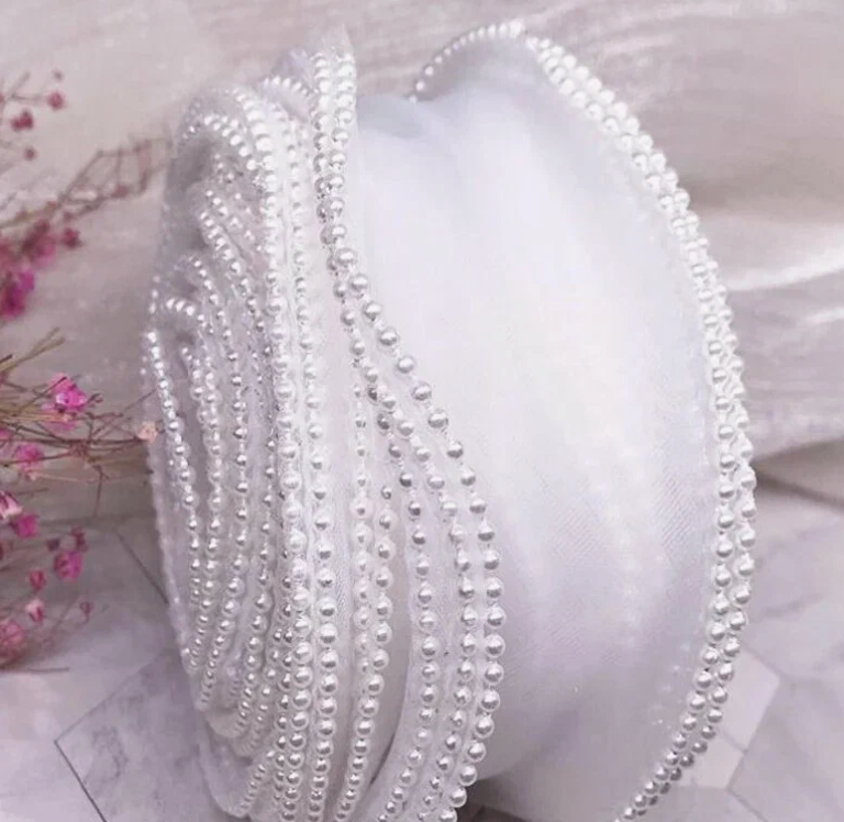 Лента органза с бусинками белая кудрявая 9 метров 4 см