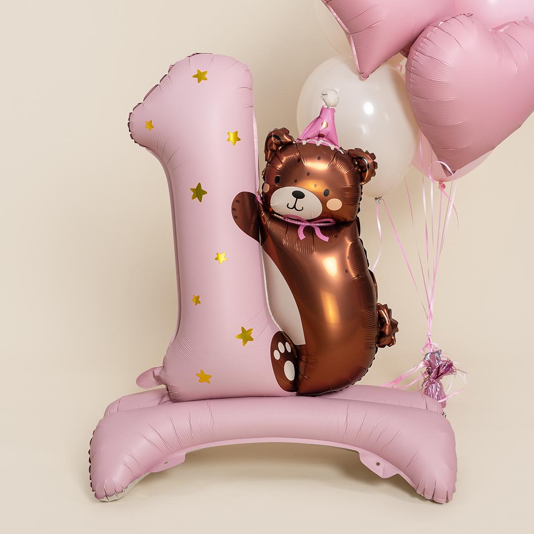 Шар фольгированный цифра 1 с мишкой розовая 98 см 1 шт