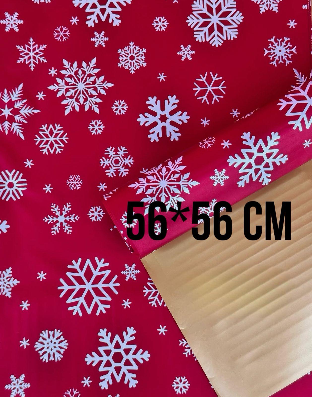 Бумага упаковочная снежинки белые на красном 56*56 см 1 шт