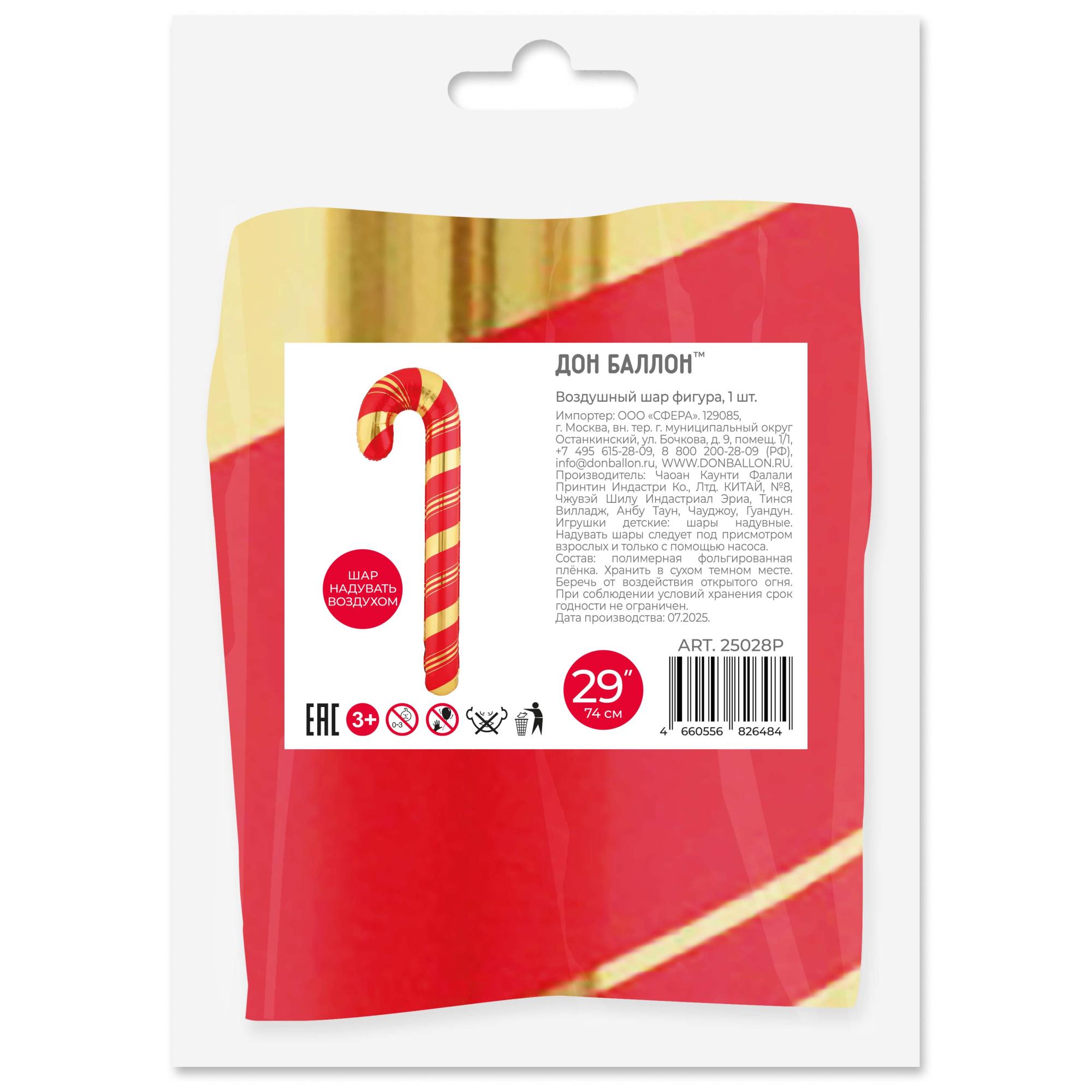 Шар (29''/74 см) Фигура, Леденец трость (надув воздухом), Красный/Золото, 1 шт. в уп.