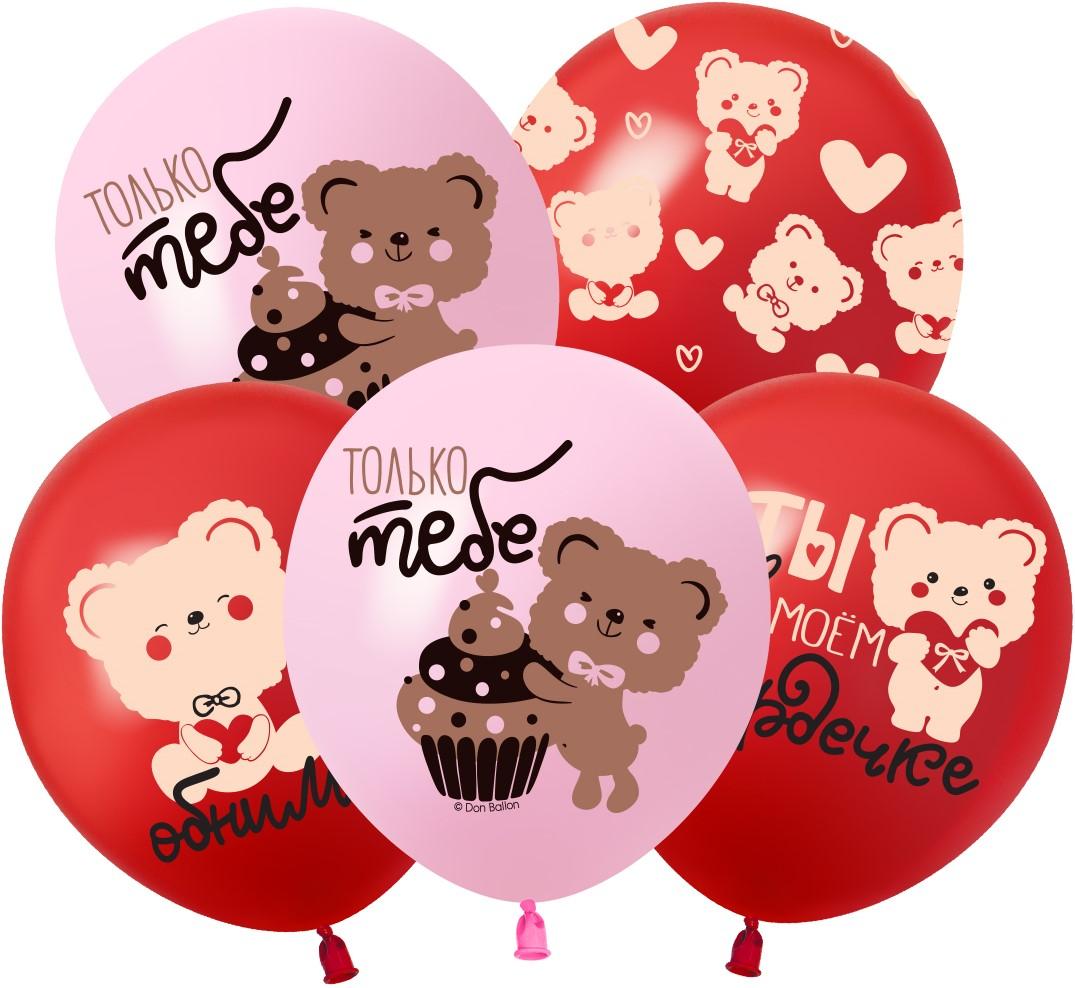 Шар (12''/30 см) Влюбленные мишки, Розовый/Красный, пастель 5 шт